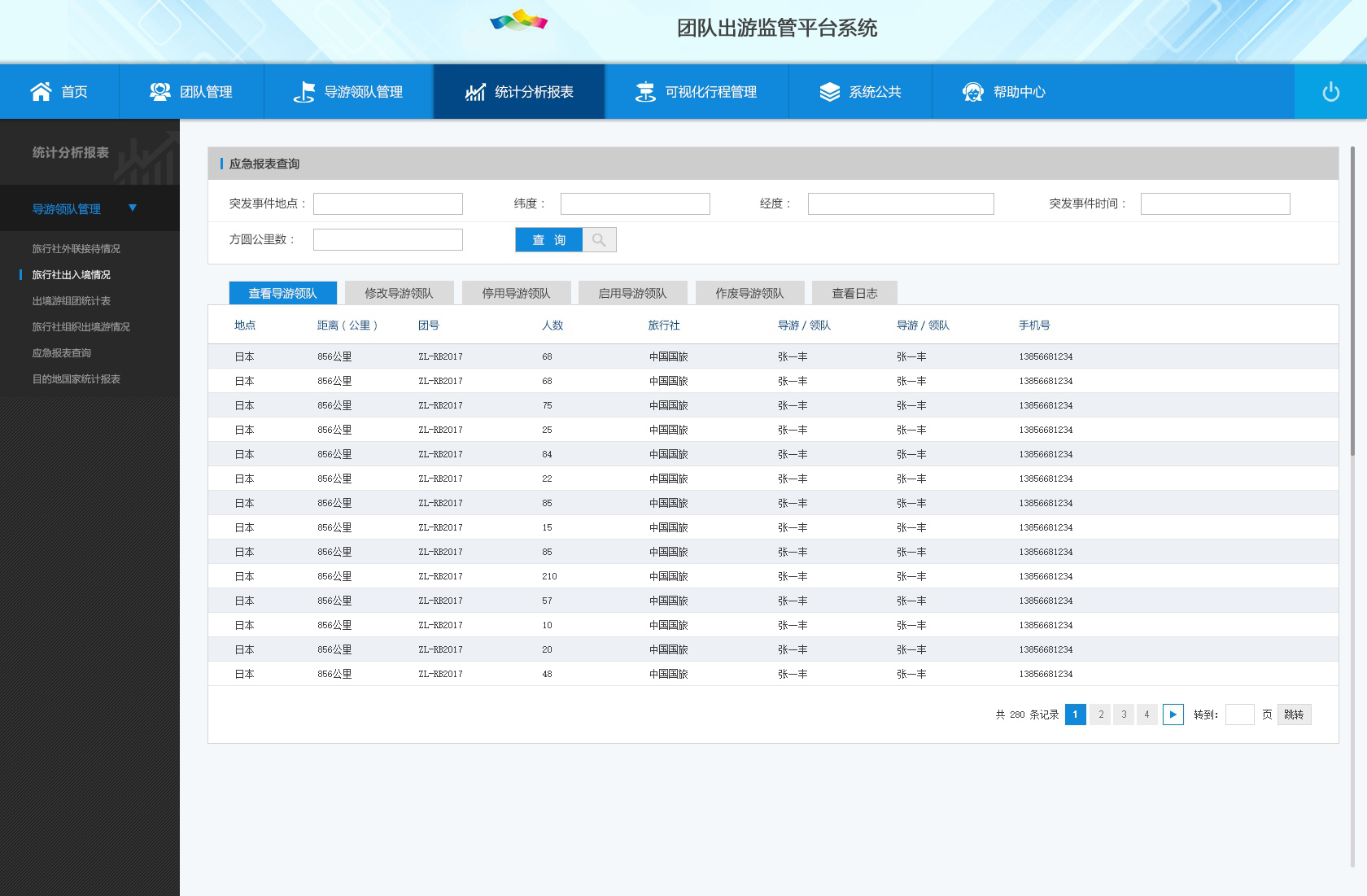 3)  統(tǒng)計(jì)分析報(bào)表:目的地國家統(tǒng)計(jì)表、應(yīng)急報(bào)表查詢、旅行社外聯(lián)接待情況、旅行社出入境情況、出境游組團(tuán)統(tǒng)計(jì)表。