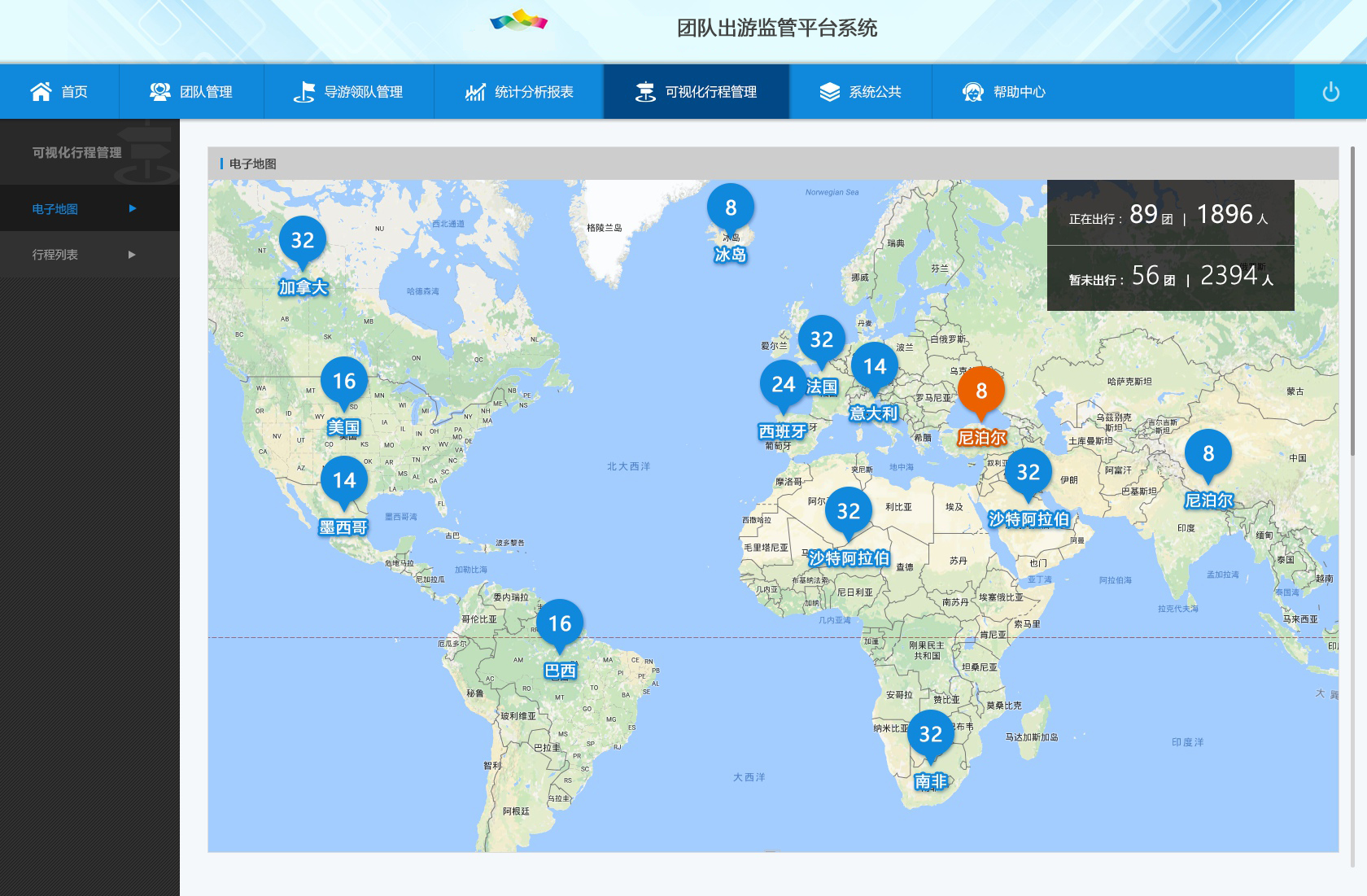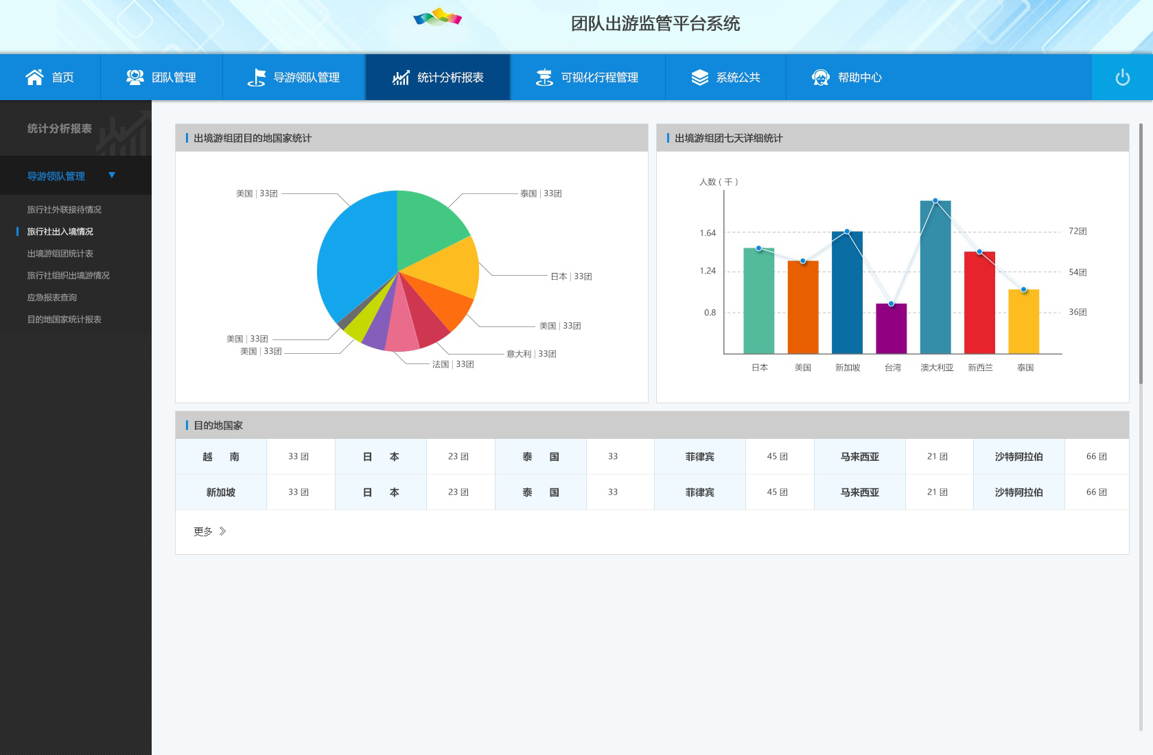 團(tuán)隊(duì)出境旅游監(jiān)測與分析對接國家旅游團(tuán)隊(duì)管理系統(tǒng)數(shù)據(jù),通過對旅游團(tuán)電子行程單和旅游合同數(shù)據(jù)的接入,實(shí)現(xiàn)對出境旅游團(tuán)隊(duì)監(jiān)測監(jiān)管,方便在發(fā)生旅游突發(fā)事件時(shí)迅速開展救援、服務(wù)工作。