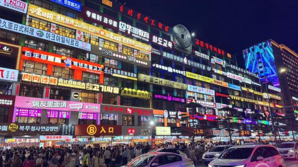 深夜十一點,延邊大學“網(wǎng)紅彈幕墻”前依然人頭攢動,游客們舉著印有“延吉”字樣的咖啡杯拍照打卡,打糕、冷面、米腸等特色美食香氣四溢,這座東北邊境小城的夜,剛剛開始。