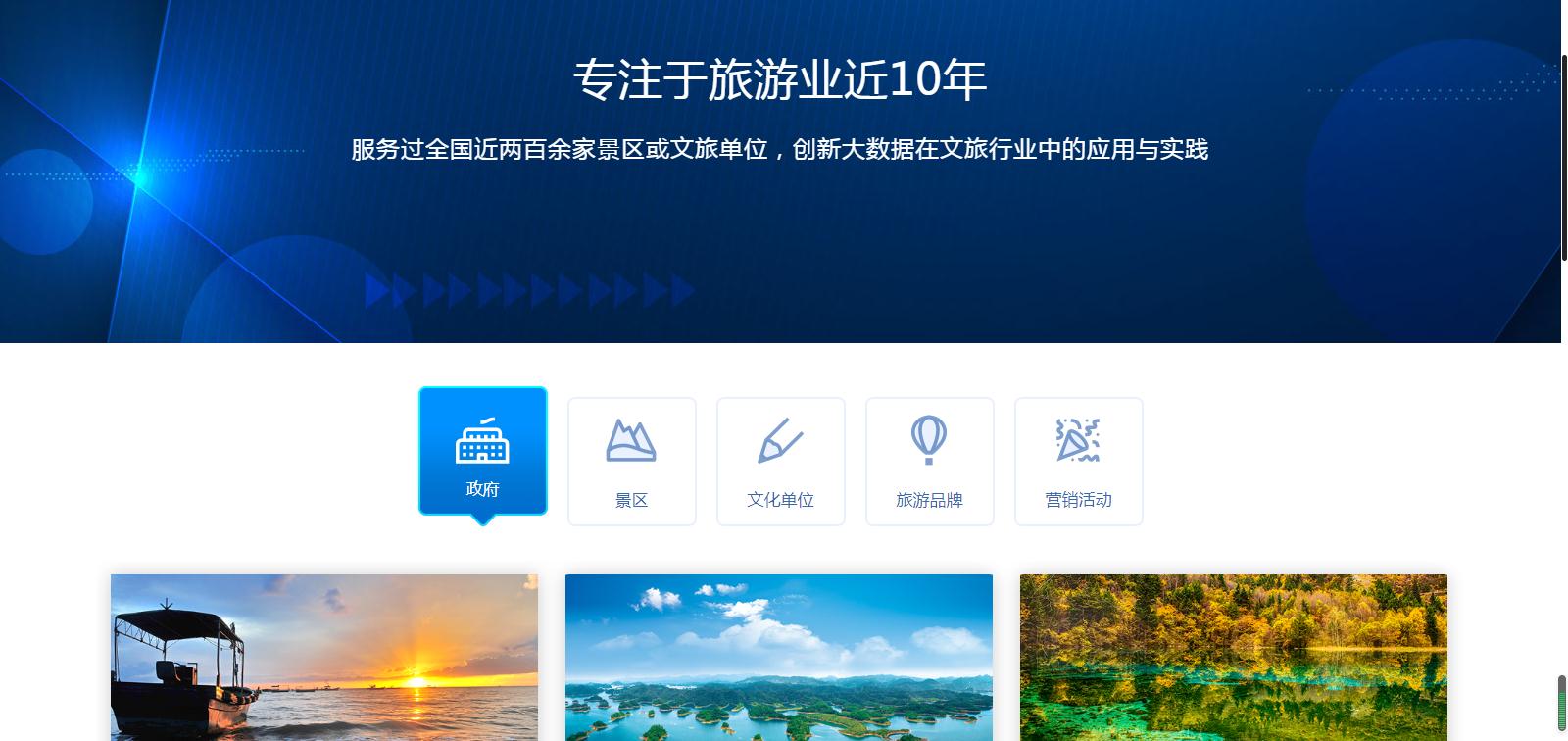針對(duì)不同用戶屬性,分為政府單位、景區(qū)用戶、文化單位、涉旅企業(yè)。為不同行業(yè)客戶及合作伙伴,提供更為詳盡的方案支持,如政府單位的全域旅游“121工程”、景區(qū)用戶的“1234 M”技術(shù)、文化單位的服務(wù)平臺(tái)建設(shè)體系、涉旅企業(yè)的電子商務(wù)系統(tǒng)和活動(dòng)營銷平臺(tái)。